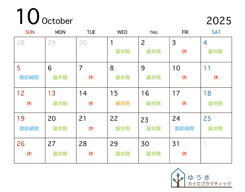 10月の営業案内は下記の通りになります。11、12、26日は所用のため15日は出張治療のため袋井院は休院となります。よろしくお願いいたします。